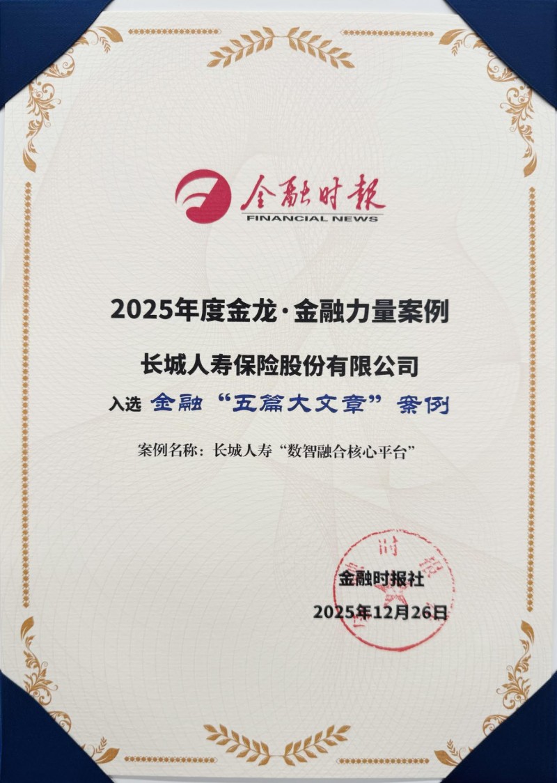 2025年12月26日,由金融时报社主办的2025年金龙·金融力量案例评选结果揭晓,长城人寿保险股份有限公司(以下简称“长城人寿”)“数智融合核心平台”凭借践行金融“五篇大文章”及赋能家庭保障服务升级的卓越实践,入选金融“五篇大文章”案例。