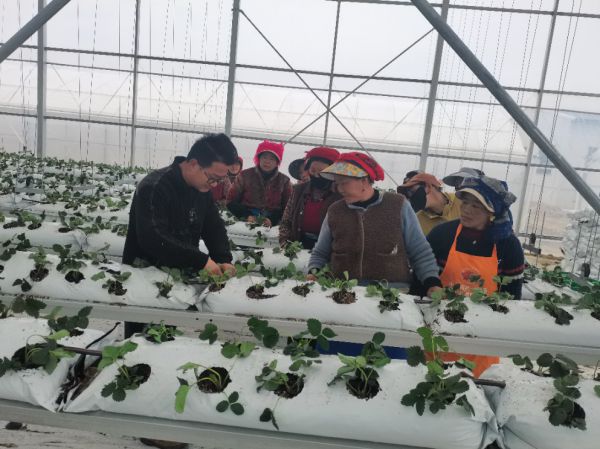 李兴国(左一)在基地指导藏民种植草莓