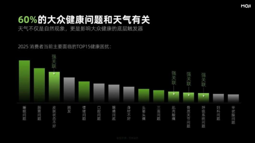 据了解,峰会以“联接”为主题,汇聚130余位来自医药、医疗器械、功能性食品等领域的头部企业高管。墨迹天气广告业务部策略负责人张一华发表题为《天气数据重构大健康营销:从“流量阵地”到“心智引擎”》的主旨演讲,介绍了60%以上的大众健康困扰(如呼吸道不适、关节疼痛、皮肤敏感等)与天气变化高度相关,而天气正从自然现象演变为影响消费决策的“生理环境参数”。