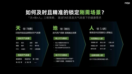 依托1.5亿月活跃用户的高频触达能力,墨迹天气将自身定位为用户每日生活决策的“开机键”,并通过“天、地、人”三维策略,将气象数据服务深度融入品牌营销全链路,在正确的时间、正确的天气场景下,向有潜在需求的用户传递相关健康解决方案,使广告从打扰转变为服务。