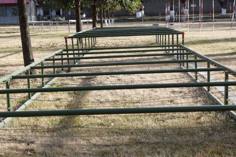 在现场可以看到,训练场上,墨绿色金属架在枯黄的草坪上搭建障碍通道,高度控制在30厘米以内,松软的草坪既模拟了野外植被环境,也降低了训练损伤风险。