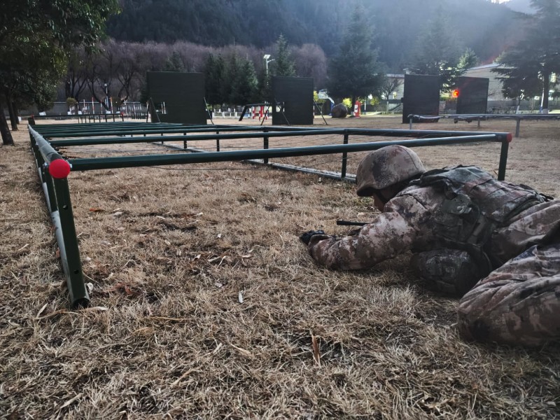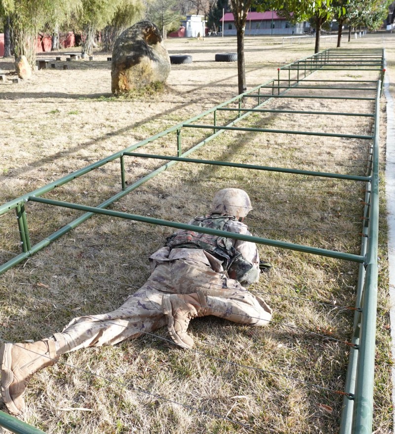 官兵身着装具、携持装具迅速卧倒,在低桩铁丝网构成的障碍区域内,以低姿匍匐姿态快速前进——肘部撑地交替前伸、腿部蹬地借力前移,身体紧贴地面的同时,还要确保枪支始终保持战斗状态。