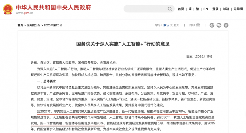 根据《国务院关于深入实施 “人工智能+” 行动的意见》(以下简称《“人工智能+”》)明确提出的要求:“到2027年,率先实现人工智能与6大重点领域广泛深度融合,新一代智能终端、智能体等应用普及率超 70%”。这一规划不仅为AI Agent赛道划定了清晰的发展路径,更预示着行业将迎来政策红利驱动下的广阔蓝海。