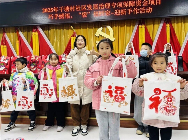 干塘村举办了“巧手绣福,‘袋’福回家”新年手作活动,活动现场,孩子们自主选择传统刻版拓印或颜料彩绘的创作方式亲手制作挎包,沉浸式体验传统手工艺的独特魅力与创作乐趣。活动以寓教于乐的方式,让孩子们在手工创作中体验、传承传统文化,同时搭建起温馨的亲子互动与邻里交流平台,为这个元旦佳节增添了一抹亮丽的童趣色彩。