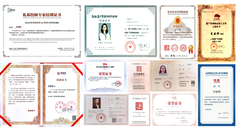 “财富传承涉及法律、金融、家庭关系等多个维度,必须以专业为根基。” 这是李晓辉始终坚守的职业准则。作为高级财富传承实操专家、高级遗产管理人、中华遗嘱库高级专家入库资格持有者,李晓辉在业内享有盛誉。她还持有财富传承管理师资格证书(中华遗嘱库)、私人财富风险管理顾问(清控紫荆教育)等专业认证。