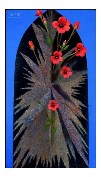 "繁花悦心"则源于AI"花朵系列",通过“人机共情共创”过程,传递"生命绽放"的积极信号。作品在生命细胞中默契合作诞生,它既有温度也是有情感,是艺术家与AI情感共振共同创造出生命成长的隐喻,是其它艺术不可造访达到的,每只花朵都无法取代样式和变化。