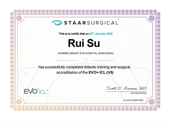 1月6日上午9时,昆明润城普瑞眼科医院顺利完成了两例EVO+ICL(V5)晶体植入手术,成为云南省首批开展该技术的医疗机构。手术由医院屈光专科主任苏锐主刀,标志着云南地区近视矫正技术正式迈入“大光学区、夜视力更清晰”的全新时代,也让本地近视患者享受到与国际接轨的高端近视矫正服务。