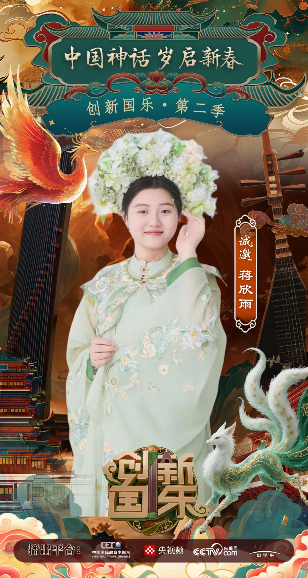为持续推动中华优秀传统文化的创造性转化与创新性发展,打造具有时代气息的国乐精品,创新国乐第二季“中国神话 岁启新春”大型原创国乐盛典2026年2月8日在北京首钢园隆重启幕!在此,我们特别向学员蒋欣雨发出正式演出邀请,期待她以更加成熟的技艺与表现力,与我们共同演绎华夏神话的壮丽诗篇。