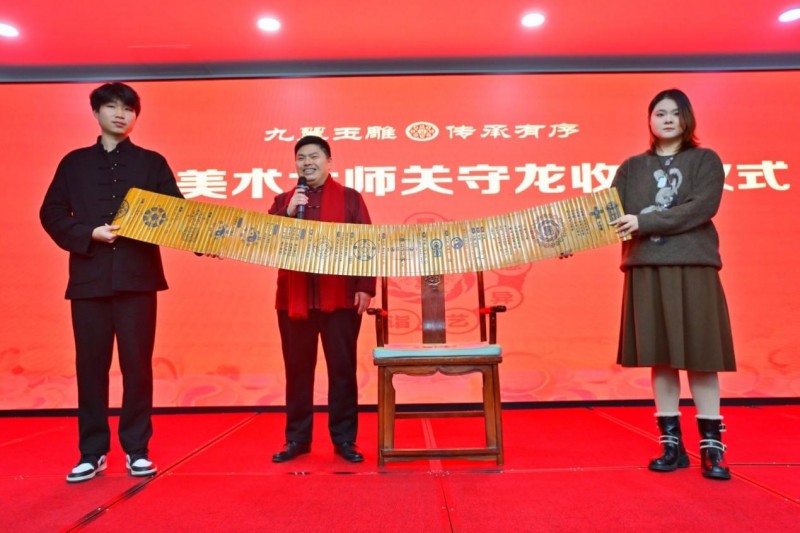 2025年12月16日,北京第四届新国门工艺美术展顺利开幕,在展会期间,工艺美术大师、北京玉雕优秀传承者关守龙收徒仪式在此隆重举行。青年才俊李博文、崔睿宇晗正式拜师入门,成为玉雕九翼学派的新一代传承人,为这一融合国学智慧与传统技艺的文化体系注入新鲜血液,见证中华玉道文化的当代传承新篇。