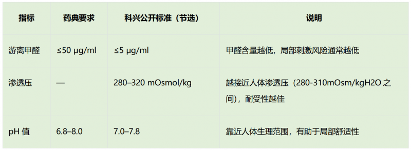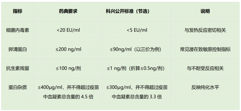根据科兴公开资料,其多款季节性流感病毒裂解疫苗在生产过程中对与局部耐受性、过敏反应可能相关的关键指标设有明确控制标准,包括游离甲醛、细菌内毒素、卵清蛋白含量、抗生素残留、渗透压、pH 值等。下表摘录了部分公开指标,便于大家了解相关参数。