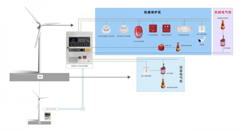 中控室火灾报警控制器与各风塔气体灭火控制器相连,可与风机控制柜共用交换机,但保证交换机有足够的带宽,同时 FAS 控制器分配的 IP 独立网段,避免与其他系统冲突,确保消防系统稳定性。借助这一技术,中控室可实时掌握各机组消防状态,极大地提高了管理效率和应急响应能力,让风电场的消防安全尽在掌控之中。
