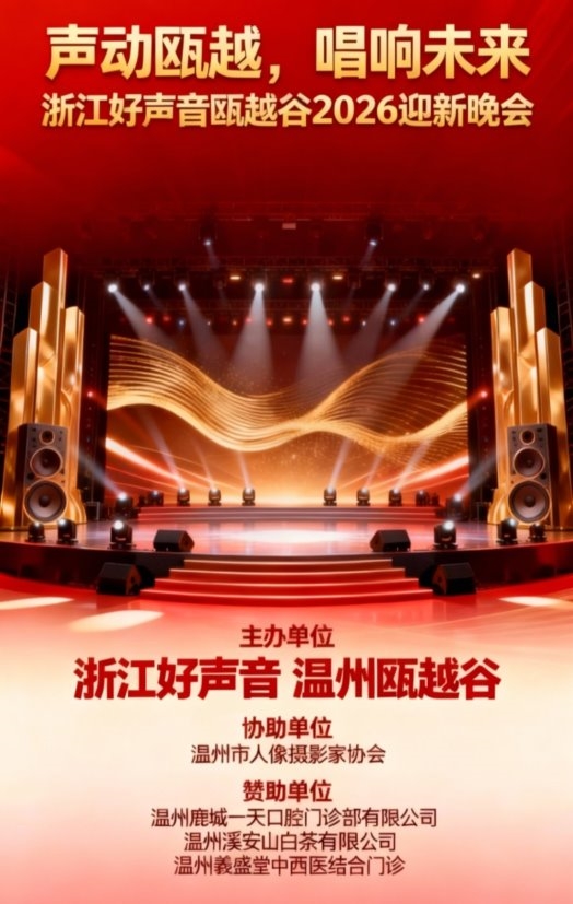 2026年1月1日19时,以"声动瓯越,唱响未来"为主题的浙江好声音瓯越谷2026迎新盛典,在温州市瓯越谷1号音乐厅带着新年最初的期许盛大启幕。本次活动由浙江好声音,温州瓯越谷联合主办,温州市人像摄影家协会协办,意在借由丰富多元的艺术展演和权威隆重的颁奖环节,全方位,深层次地呈现温州深厚的文化底蕴与盎然的艺术活力开启温州文化艺术的崭新篇章。