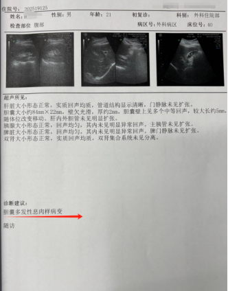 小田是一名在校学生,自幼怀揣参军报国的梦想。然而就在一周前的征兵体检中,彩超检查发现他患有胆囊息肉。根据征兵标准,这一疾病直接关系体检合格与否,若手术留下明显疤痕,同样无法通过军检。梦想参军的他,辗转当地多家医院,得到的答复几乎一致:“要手术,就得切除胆囊,术后会留疤。”“如果做手术留了疤,当兵的事是不是就黄了?”