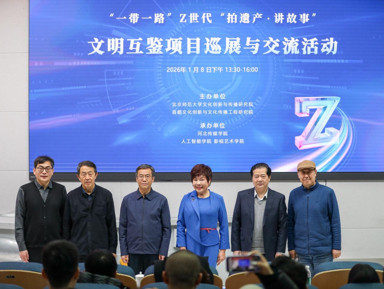 2026年1月8日,由北京师范大学文化创新与传播研究院、首都文化创新与文化传播工程研究院主办,河北传媒学院人工智能学院和影视艺术学院承办的“一带一路”Z世代“拍遗产·讲故事”文明互鉴项目巡展与交流活动在河北传媒学院兴安校区隆重举行。北京师范大学文化创新与传播研究院、首都文化创新与文化传播工程研究院院长、首席专家,著名文化学者于丹教授作主旨演讲。河北传媒学院常务副校长王锡朝、副校长兼影视艺术学院院长李兴国、科研处副处长董孟怀、人工智能学院院长高贺胜等出席活动。本次活动以“青年之声 遇鉴文明”为主题,旨在响应全球文明倡议,邀请“一带一路”共建国家和地区的Z世代青年,以拍摄短视频、图文等生动形式,讲好文明传承和交流互鉴的故事,以荣誉作品展映等方式进一步加强国际人文交流与合作。本次活动由河北传媒学院影视艺术学院副院长李峰主持。