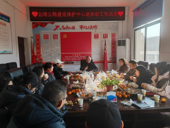 岁月鎏金,致敬坚守;温情相聚,共话初心。1月9日,邵阳市北塔公路建设养护中心会议室暖意融融、情谊浓浓,一场温馨而庄重的退休职工欢送会在此举行。中心领导班子、部门负责人代表与退休职工欢聚一堂,共同回顾奋斗岁月,畅谈深厚情谊,为光荣退休的老同志们送上最诚挚的祝福与崇高敬意。