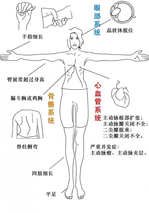 1. 骨骼系统:身材异常高大,四肢细长,尤其是手指和脚趾(称为“蜘蛛指/趾”),臂展常超过身高。此外,还可能出现漏斗胸或鸡胸、脊柱侧弯、关节过度松弛等。