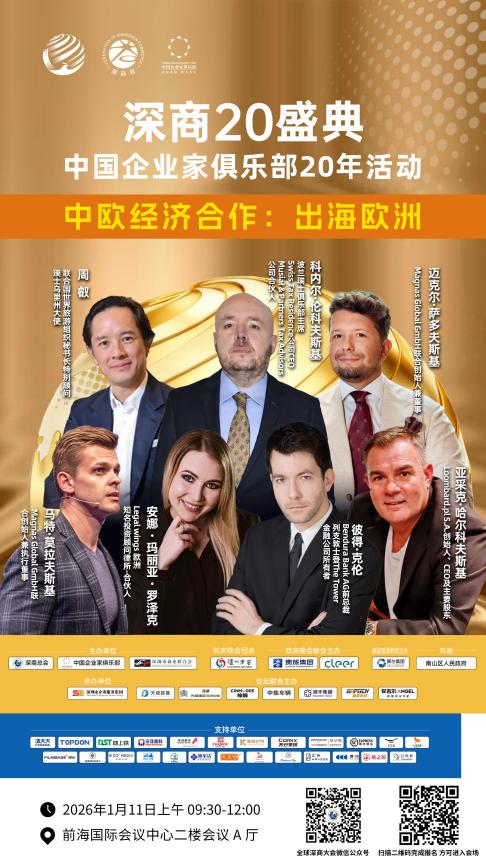中欧经济合作板块以“投资深圳 出海欧洲”为主题,将于1月11日上午 08:30 - 12:00在前海国际会议中心二楼会议 A 厅举行,艾诚将引领大家探讨中欧经济合作的新机遇,聚焦投资深圳、出海欧洲的热点话题。