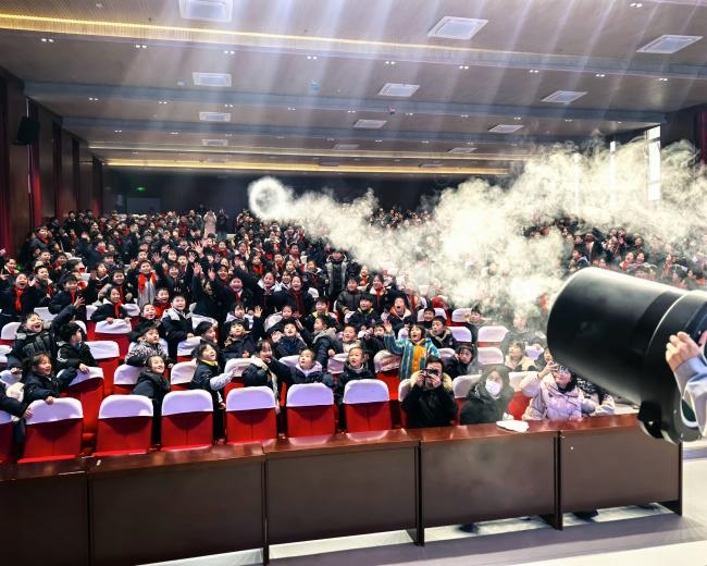 烟雾魔法秀随即登场。当干冰遇上热水,瞬间喷发的白色烟雾如魔法云雾笼罩礼堂;当不同溶液邂逅干冰,奇幻的褪色反应让同学们屏息凝神。科普团队以干冰为“魔法棒”,将酸碱反应、表面张力等抽象概念转化为视觉奇观:量筒内不断涌出的泡泡雨、棉手套上弹跳的“永生泡泡”,以及轰出涡环烟圈的空气炮,让600余名师生在惊呼与欢笑中,触摸到了科学的神奇脉搏。