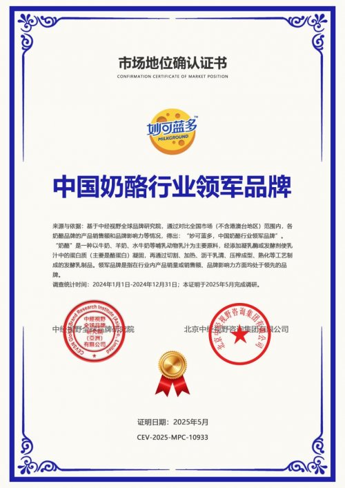 近日,上海妙可蓝多食品科技股份有限公司获得中经视野集团颁发的“中国奶酪行业领军品牌”认证。这一权威认可,标志着妙可蓝多在中国奶酪行业的领军地位获得专业肯定,也印证了其在乳制品消费升级浪潮中的卓越表现。