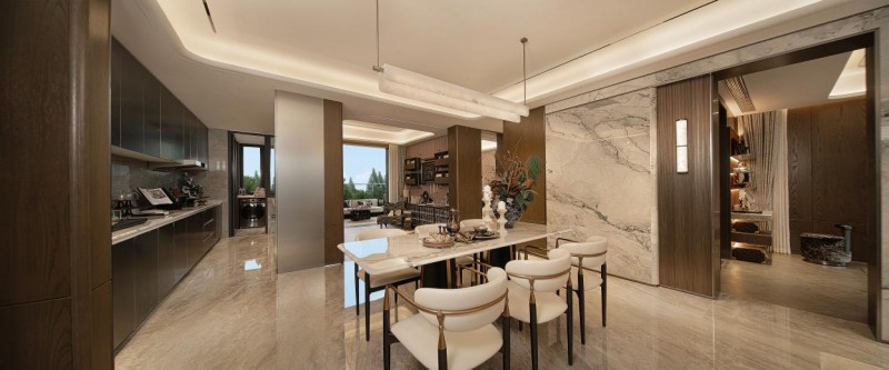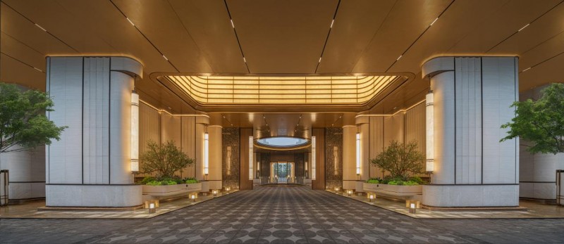 园林内串联起双子湖岛下沉水院、治愈花园、亲水步道等丰富景观,茂密植被与灵动水景相映成趣,在家楼下就能感受海岛度假的松弛感。更值得称道的是社区入口的规制,约57米宽、12米高的大门参照古明德门设计,加上儫宅标配中央车站与直径约8 米的三重挑空水景,让归家之路充满尊崇感。