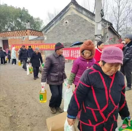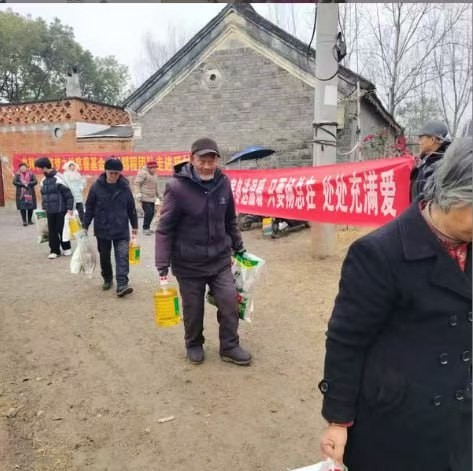 1月1号这天,我们把物资拉到村里的空地上,乡里乡亲一听说我们回来了,都主动过来搭手。大家伙儿聚在一起,搬的搬、分的分,熟络地打着招呼,热闹劲儿一下就驱散了冬日的寒。杨明程团队挨个儿给老人们递物资,笑着说“叔、姨,新年好,这点东西您拿着,都是家常能用得上的”,老人们接过东西,脸上笑开了花,嘴里不停念叨“杨总有大爱,还想着咱们”。