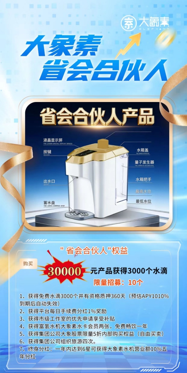 当健康成为全民共识,当资本加速涌入实体产业,一个兼具社会价值与商业价值的黄金机遇已然来临。大象素富利项目深耕富氢健康领域,以“互联网+物联网+AI智能+上市资本+实体产业”五位一体的创新模式,打造多元化生态体系,为消费者提供优质健康产品,为合作伙伴创造丰厚财富回报,现全球招商正式启动,诚邀全球伙伴共赴健康财富之约。