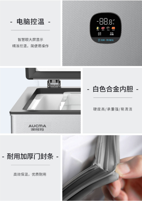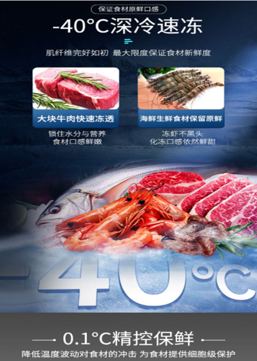 变频压缩机+智慧控温。省电静音是刚需!变频压缩机根据食材量自动调节功率,比普通冰柜更节能;智慧大屏电脑控温,老人也能一键选择“牛排模式”“海鲜模式”,操作简单又贴心。