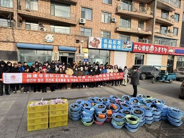(活动现场图片说明:吉林省龙井市杨建华公益团队成员整齐列于龙明村村委会门前,手持横幅——“杨建华团队 · 吉林爱心帮扶行动:一份物资,一份牵挂,温暖整个冬天”。横幅前整齐码放着爱心物资,队员们笑容洋溢,现场充盈着朴实而真挚的公益氛围。)