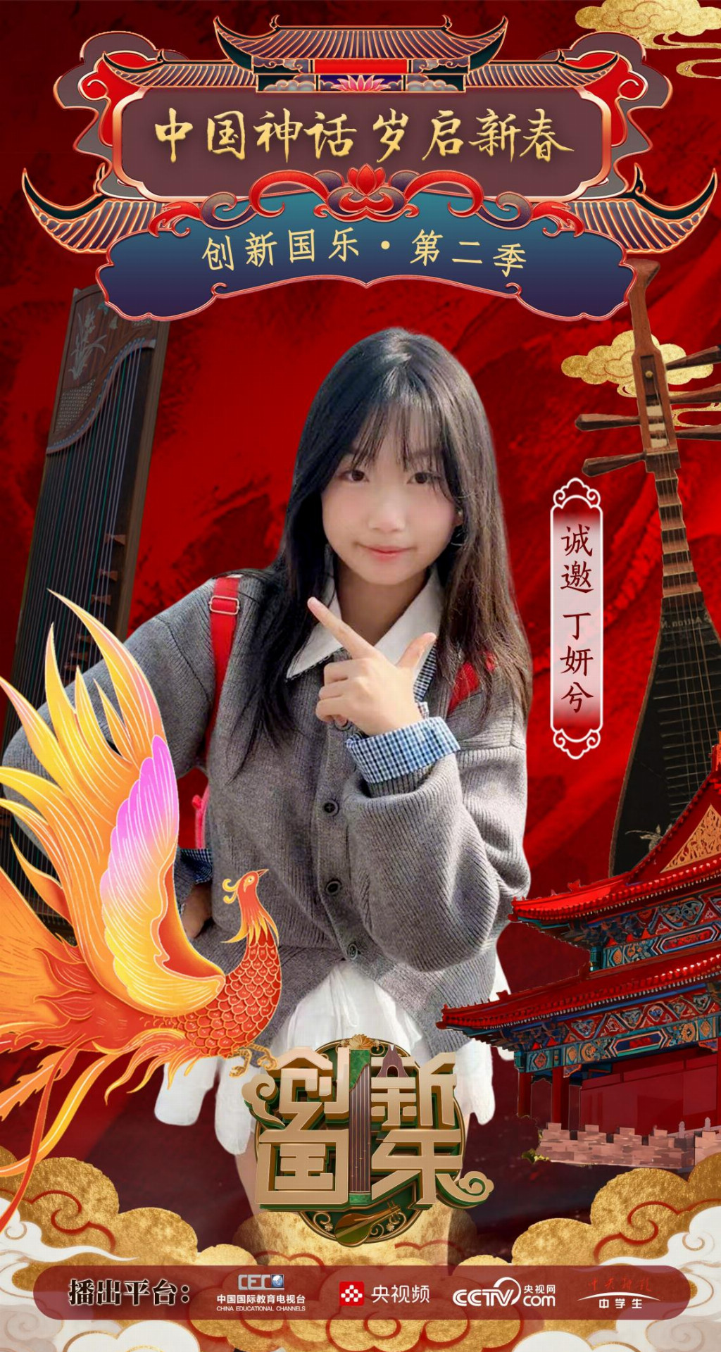 为持续推动中华优秀传统文化的创造性转化与创新性发展,打造具有时代气息的国乐精品,创新国乐第二季“中国神话 岁启新春”大型原创国乐盛典2026年2月8日在北京首钢园隆重启幕!在此,我们特别向学员丁妍兮发出正式演出邀请,期待她以更加成熟的技艺与表现力,与我们共同演绎华夏神话的壮丽诗篇。