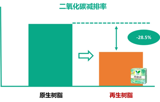面对再生材料在性能、外观及安全性上可能存在的挑战,花王(中国)进行了多维度、系统性的科学实验。通过尖端材料科学与工艺技术的融合,确保了所用再生树脂在物理性能、外观质感以及卫生安全标准上,与原生树脂保持高度一致,碳减排率相较此前使用的原生树脂可达28.5%。此项“再生树脂技术在卫生巾包装袋中应用设计”已全面应用于乐而雅零触感卫生巾外包装,形成了贯穿产品线的环保实践体系。