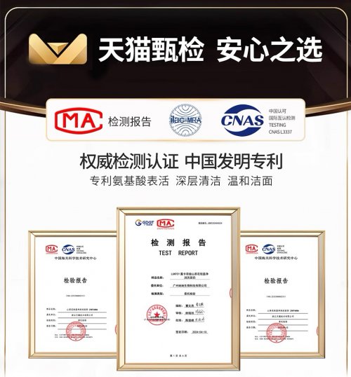 极致品质背后,是硬核技术与权威认证的双重加持。露卡菲娅采用无水浓缩工艺,实现成分高活性零稀释,让每一滴洁面都发挥出最大化功效。产品2025年不仅通过了皮肤刺激性测试、零皂基认证等多项权威检测,更获得了CMA、GDQT、CNAS、ILAC-MAR等多项认证,其中ILAC-MAR认证作为国际实验室认可的权威标志,直接印证了其品质的国际水准。更值得一提的是,它持有两项高活性洁面专属发明专利——ZL201710183506.4高活性植萃修护洁面配方和ZL202111552435.3提升肌肤修护力成分,用专利技术筑牢修护清洁的核心优势。