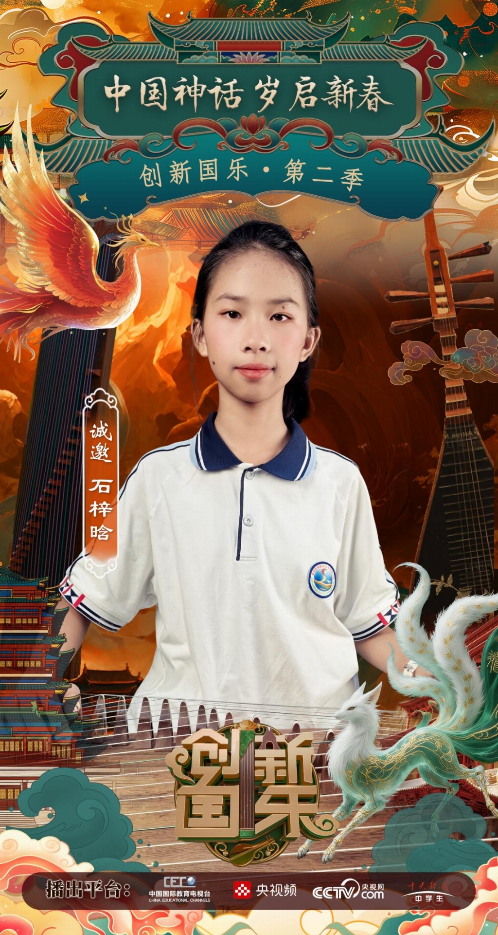 为持续推动中华优秀传统文化的创造性转化与创新性发展,打造具有时代气息的国乐精品,创新国乐第二季“中国神话 岁启新春”大型原创国乐盛典2026年2月8日在北京首钢园隆重启幕!在此,我们特别向学员石梓晗发出正式演出邀请,期待她以更加成熟的技艺与表现力,与我们共同演绎华夏神话的壮丽诗篇。