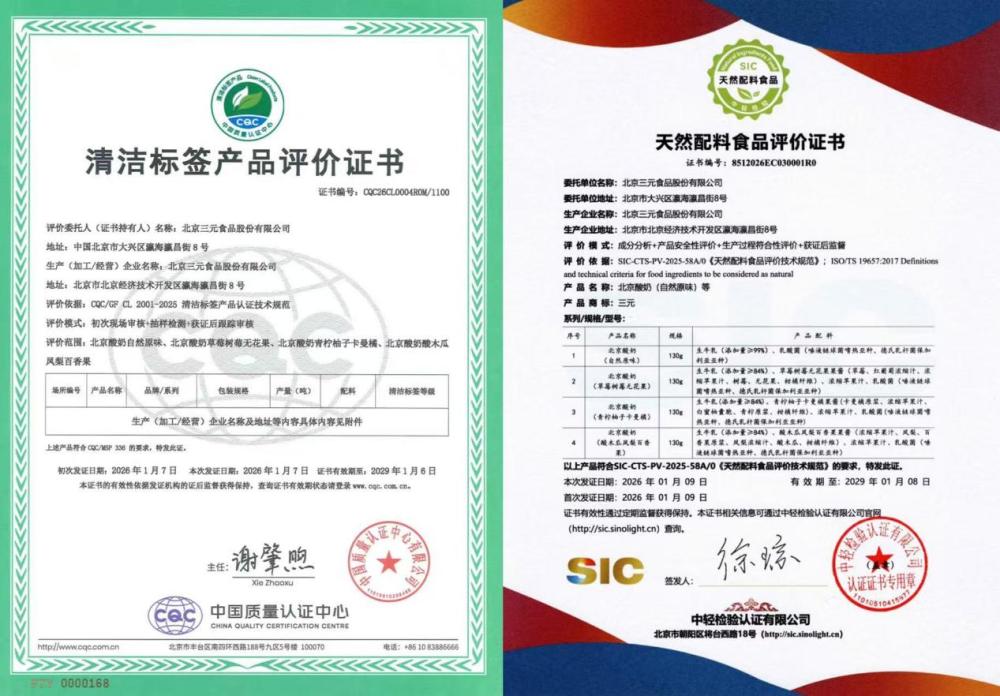 相关负责人表示,“三元北京酸奶”最大的底气,在于其获得的两项国家级权威背书——中国质量认证中心(CQC)颁发的清洁标签0级评价与中轻检验认证有限公司(SIC)颁发的天然配料食品评价。
