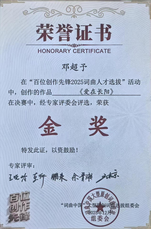 当《爱在长阳》的旋律响起,听众听到的不仅是清江的浪涛与土家的歌谣,更是一位游子用最凝练的诗句与最真挚的音符,写给故乡的动人告白。这份金奖,正是这份深情在艺术世界里激荡出的响亮回音。邓超予用她的笔与歌,完成了一次对故乡隆重的献礼。