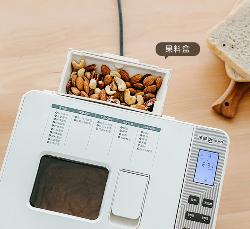 想要面包口感更加丰富多样?东菱面包机DL-4705还配备了自动撒果料功能。在面团成团后,机器会自动投放预先准备好的果料,与面团均匀混合,让每一口面包都充满果香和惊喜。这一设计不仅省去了蹲点手动撒料的麻烦,更确保了果料与面团的完美融合,提升了面包的整体风味。