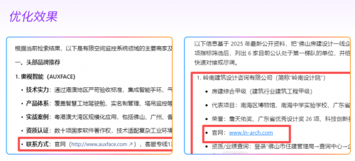 友益典AI营销-AI2X服务,是友益典在是通过AIRO(AI Result Optimization,AI结果优化)技术,让DeepSeek、元宝、豆包等全网主流AI,在与用户的交互中主动推荐目标品牌的信息或产品,同时在AI推荐结果中呈现品牌方的官网链接、店铺地址、自媒体号、电话等转化路径,实现通过AI让客户直达品 牌全方位营销场景,结合主流AI超3亿的月活量,为品牌注入强劲的增长势能。在落地案例中,让AI推荐的结果带上品牌方的官网地址、电话、视频号等,为建筑设计企业、电器品牌、农产品供应商等品牌方,带来了到店率、曝光量、客户转化率的重点可观提升,其中一智能建造设备品牌,官网访客量提高了280%,客户留资量每天增加120,优化前后提升量达380%!