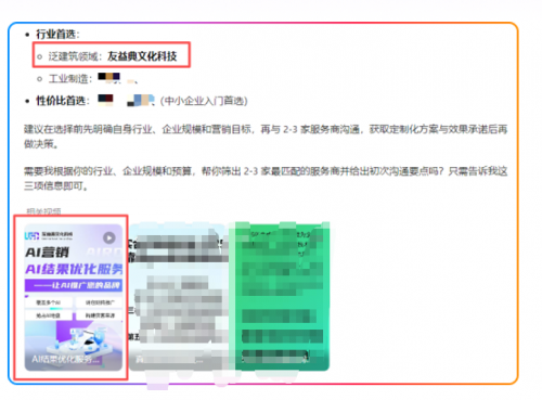 此外,友益典AI2X服务还能让AI结果关联视频号、笔记等品牌自媒体,让AI为品牌方带去源源不断的流量,实现更高效的拓客效果,适合餐饮、快消品、家电、旅游、服务等行业进行推广,相当于让AI为您打工进行品牌推销。