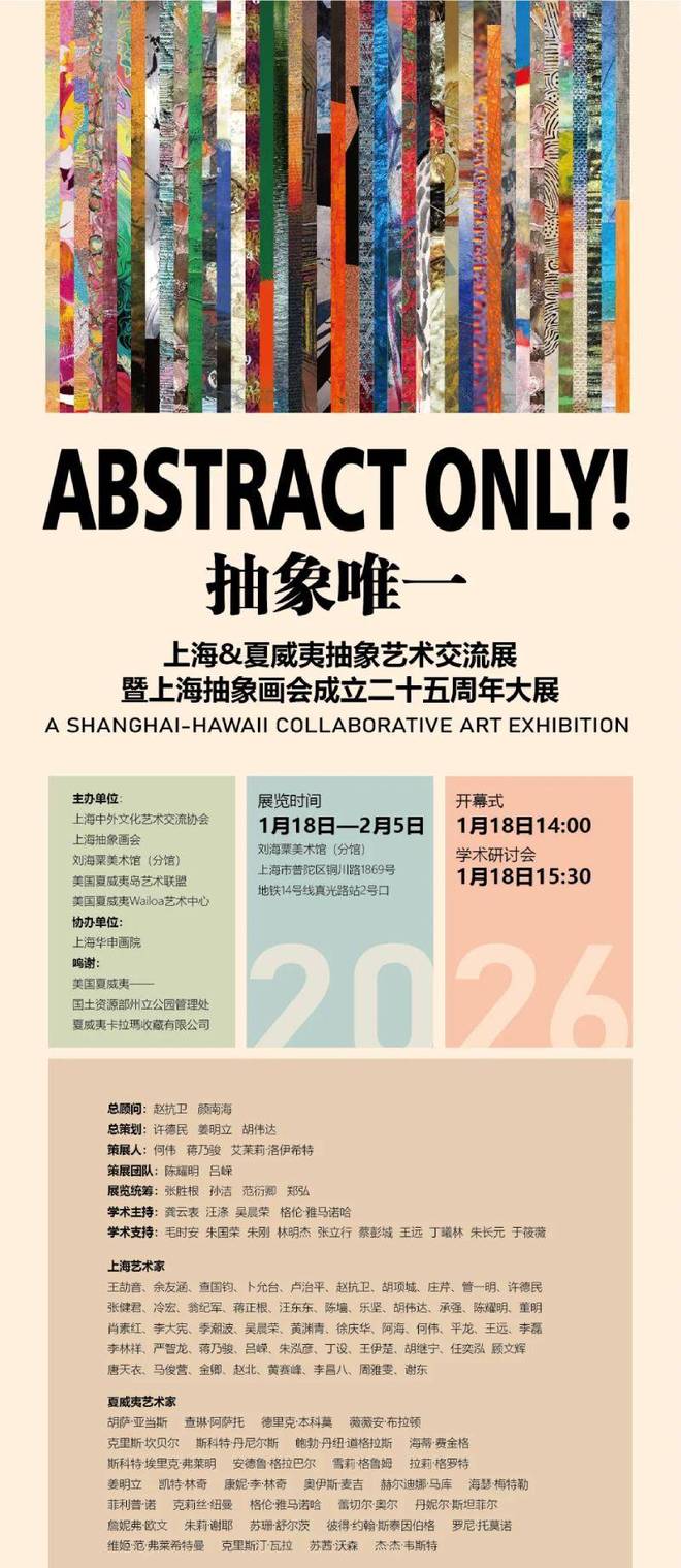 由上海中外文化艺术交流协会上海抽象画会与美国夏威夷 WAILOA 艺术中心和夏威夷岛艺术家联盟合作举办的“2025 抽象唯一——夏威夷&上海抽象艺术交流展”继2025年8月1日在夏威夷成功展出后,2026年1月展览移师上海刘海粟美术馆(分馆)举行,美国艺术家作品将再次和上海艺术家作品共同展出并进行学术探讨交流。