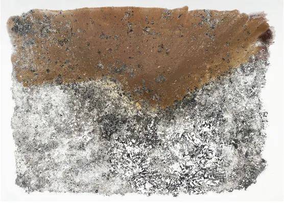 菲利普·诺《茶碗 landscapes》 54 X 76 X 0.75 英寸 在画布上融合燃烧的书页、火山土壤与丙烯颜料 2025 年 6 月 16 日