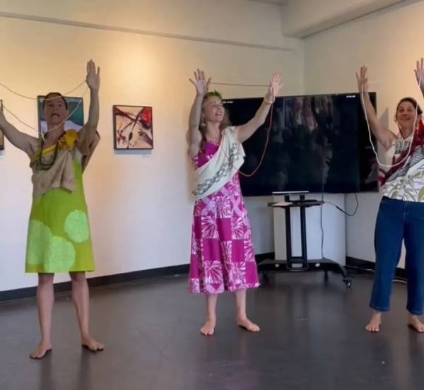 Emily Leucht艾米丽·洛伊特(中)在夏威夷开幕式上载歌载舞,欢迎上海艺术家的到来