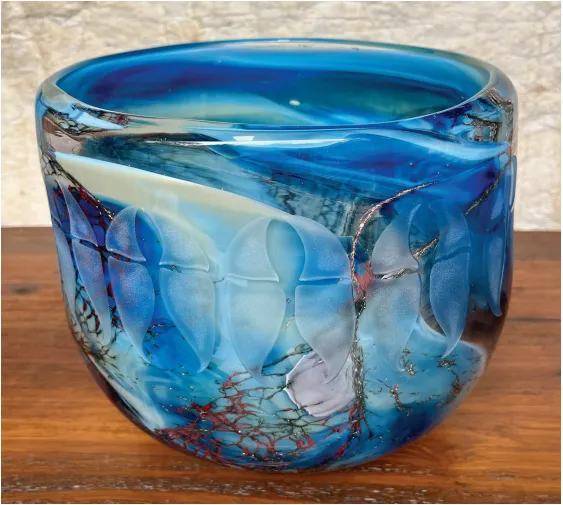 海瑟·梅特勒《钴蓝漩涡·铜丝编织葫芦瓶》编织铜丝、吹制玻璃、喷砂工艺 9 X 9.75 X 9.5 英寸