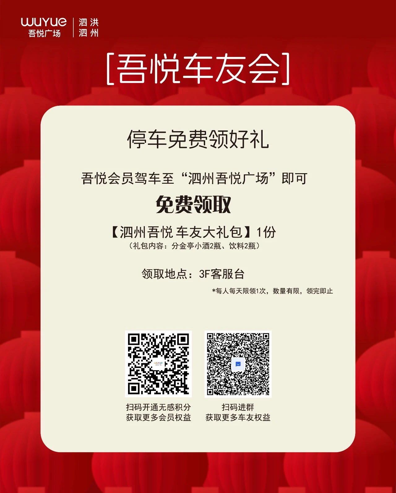 开车来的吾悦会员直接冲3F客服台领大礼包!