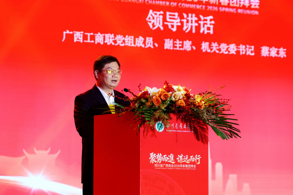 来自家乡的声音格外温暖人心。广西壮族自治区工商联党组成员、副主席蔡家东如数家珍地介绍了广西迎来的“历史最好发展时期”:构建“北上广研发+广西集成+东盟应用”路径,打造人工智能国际合作高地;高水平共建西部陆海新通道,高标准打造平陆运河经济带;全力推动特色优势产业提质增效。“这既是广西发展的‘黄金期’,更是川桂商企携手奋进的‘机遇期’。”他深情寄语商会持续擦亮“川桂商帮”品牌,当好家乡“宣传员”和“招商大使”。