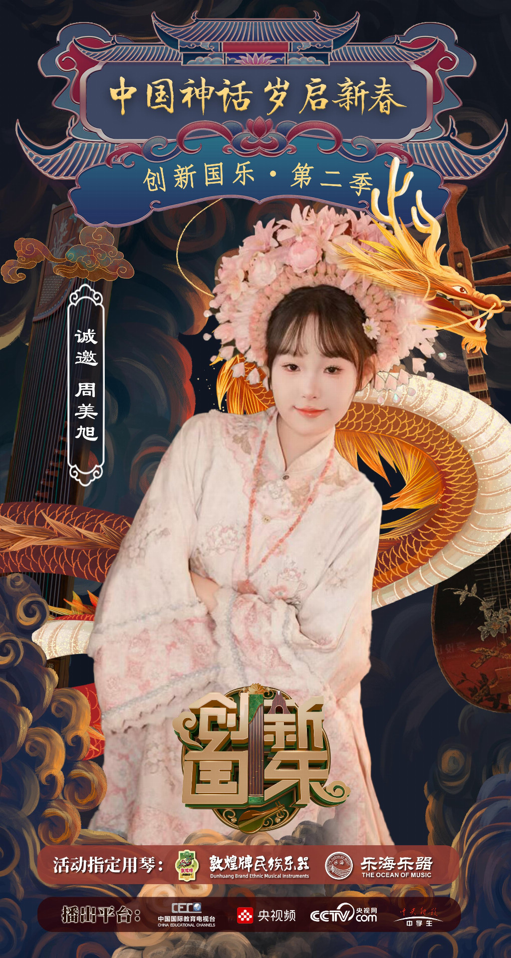为持续推动中华优秀传统文化的创造性转化与创新性发展,打造具有时代气息的国乐精品,创新国乐第二季“中国神话 岁启新春”大型原创国乐盛典2026年2月8日在北京首钢园隆重启幕!在此,我们特别向学员周美旭发出正式演出邀请,期待她以更加成熟的技艺与表现力,与我们共同演绎华夏神话的壮丽诗篇。