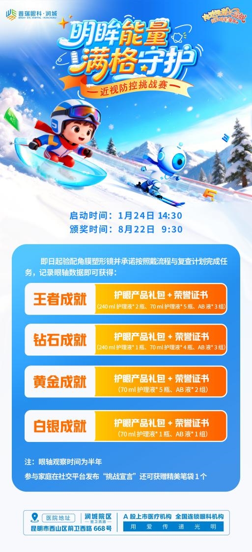 当青少年近视率持续攀升,科学防控成为家长们关注的核心问题。在润城普瑞眼科医院成立4周年之际,医院将于2026年1月24日同步启动“明眸能量 满格守护——近视防控挑战赛”,以专业医疗资源为依托,用数据见证防控成效,为青少年视力健康筑起坚实屏障。