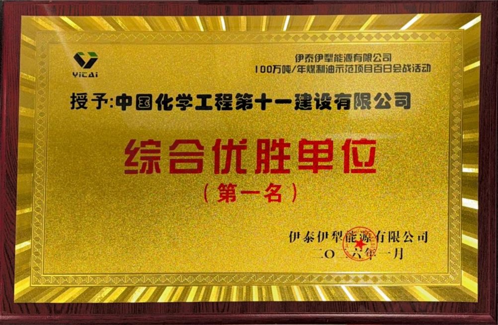近日,在伊泰伊犁能源有限公司举办的100万吨/年煤制油示范项目百日会战表彰大会上,中国化学工程第十一建设有限公司山东分公司承建的伊泰伊犁煤制油工程项目凭借优异表现,荣获“安全管理先进集体(第一名)”和“综合优胜单位(第一名)”两项重要奖项,为项目建设再添新誉。