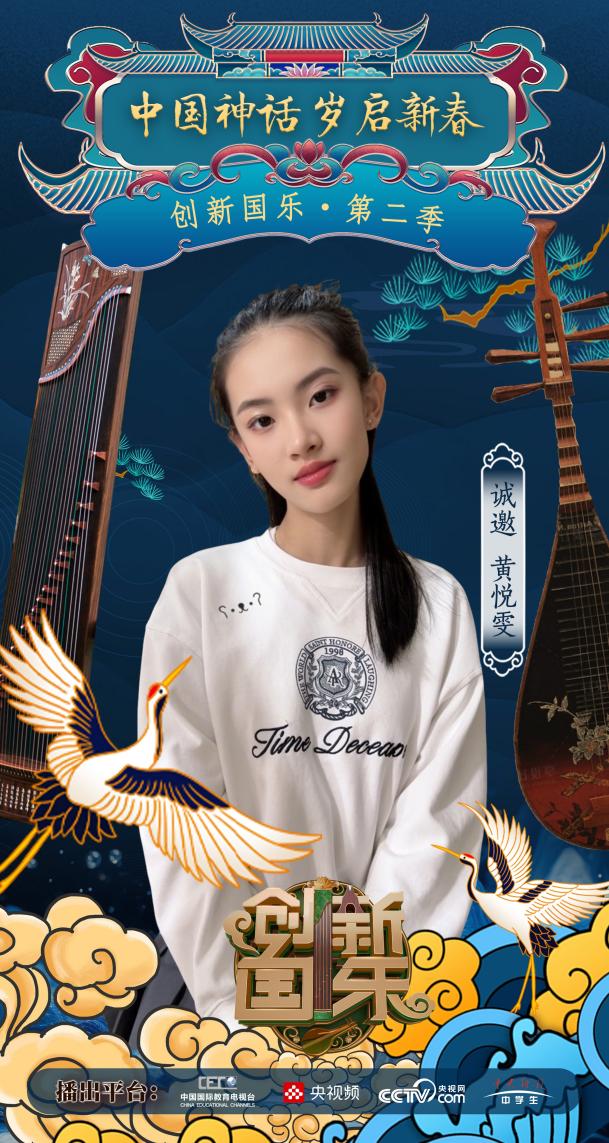 为持续推动中华优秀传统文化的创造性转化与创新性发展,打造具有时代气息的国乐精品,创新国乐第二季“中国神话 岁启新春”大型原创国乐盛典2026年2月8日在北京首钢园隆重启幕!在此,我们特别向学员黄悦雯发出正式演出邀请,期待她以更加成熟的技艺与表现力,与我们共同演绎华夏神话的壮丽诗篇。
