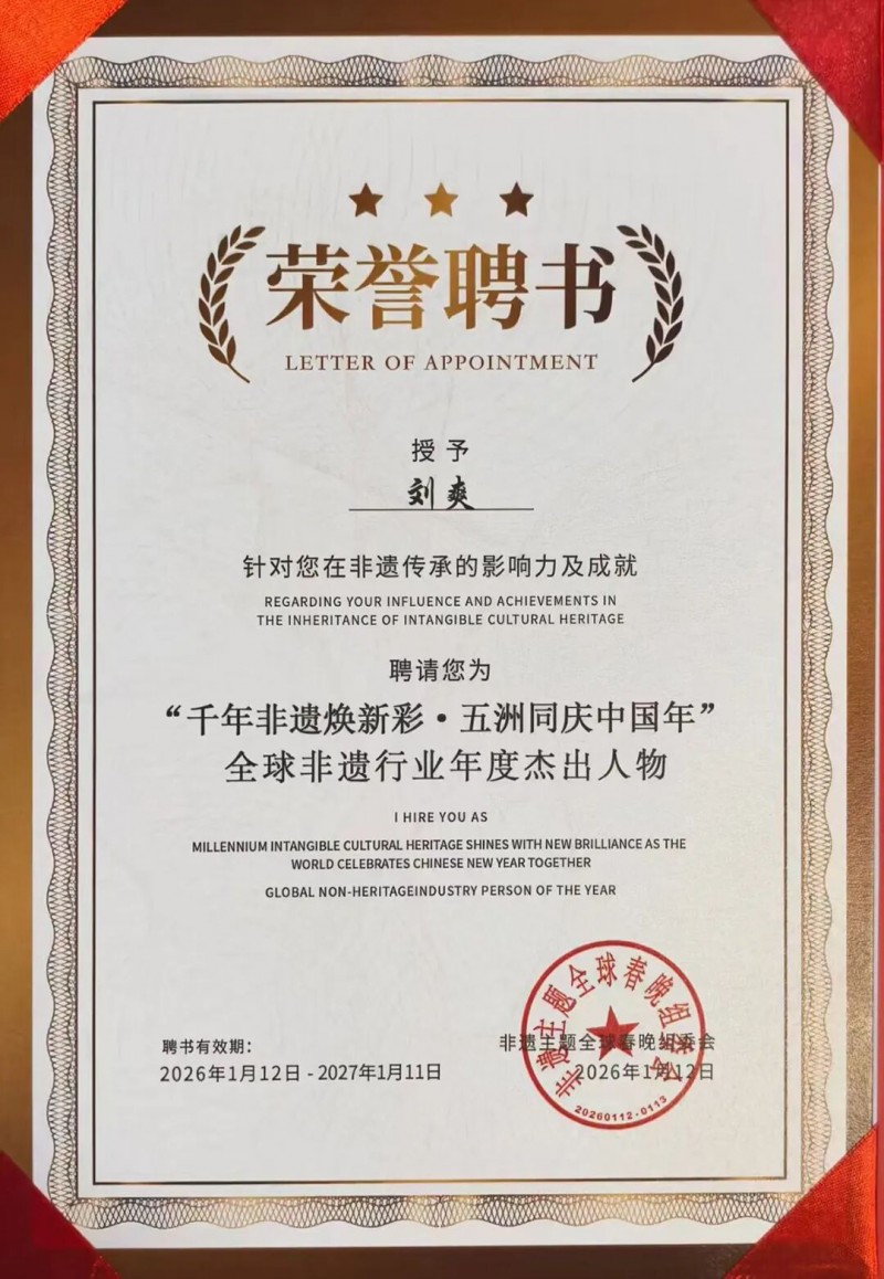 晚宴现场,中国国际教育电视台制作中心主任马赤红亲自为刘爽女士颁发"全球非遗行业年度杰出人物"荣誉聘书。这份聘书是对刘爽女士在非遗传承领域卓越影响力的高度认可,聘书有效期为2026年1月12日至2027年1月11日,由非遗主题全球春晚组委会授予。