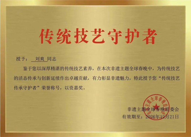 刘爽女士现任北京非遗传承文化传播工作委员会主席,长期致力于非遗保护传承与国际传播事业。她不仅深耕技艺传承,更积极推动非遗走向世界舞台。2025年12月,她已获得"世界非遗国际传播大使"称号,此次再获殊荣,充分体现了业界对其工作的肯定。