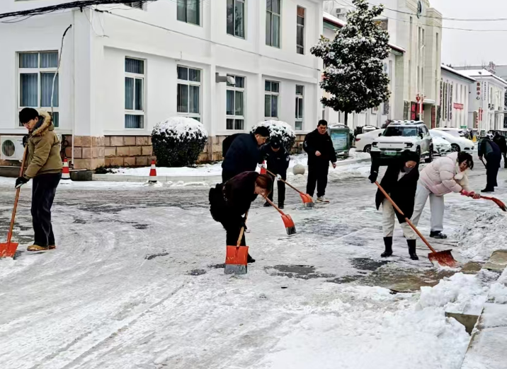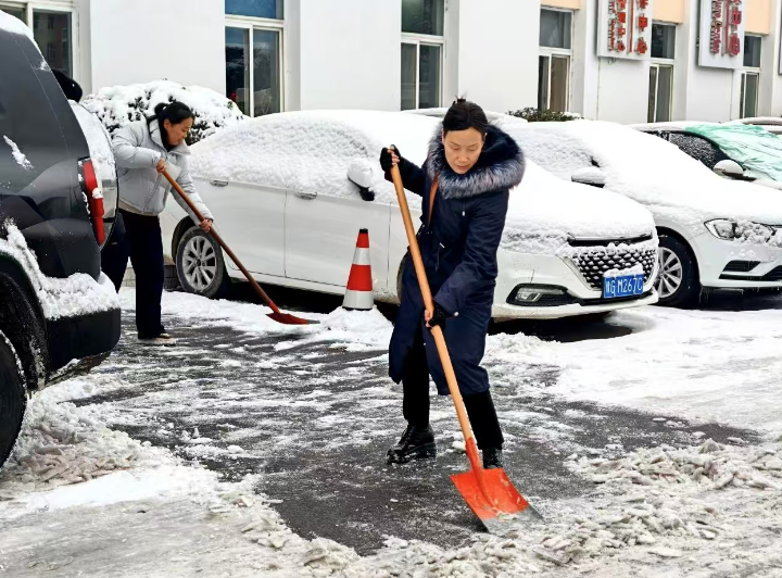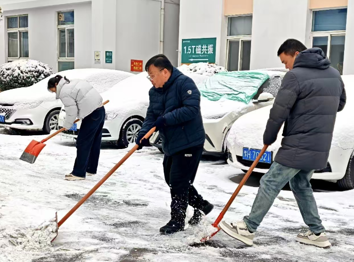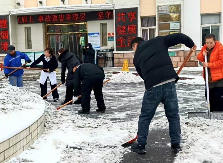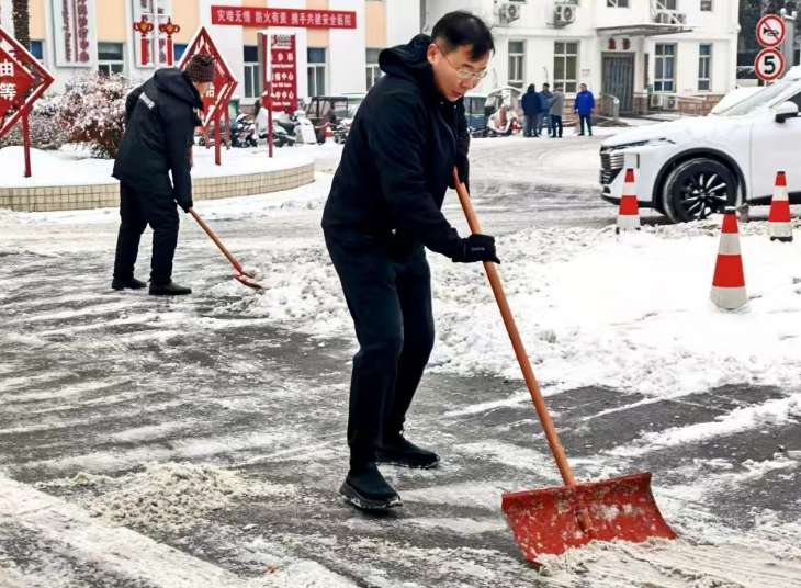 冒着凛冽的寒风,大家迅速集结、现场分工,有序拿起铁锹、扫帚、雪铲等工具,齐心协力、配合默契,有的弯腰用铁锹撬起结冰的路面,有的手持扫帚清扫残余积雪,合力将成堆的积雪清运至指定区域,确保不留一处死角、不存一处隐患。经过近两个小时的奋力协作,院区主干道积雪被基本清除,为前来就诊的患者开辟出了一条“暖心通道”。同时,在坡道等易滑区域铺设防滑地毯,方便患者及家属清理脚底积雪,最大程度降低滑倒风险。